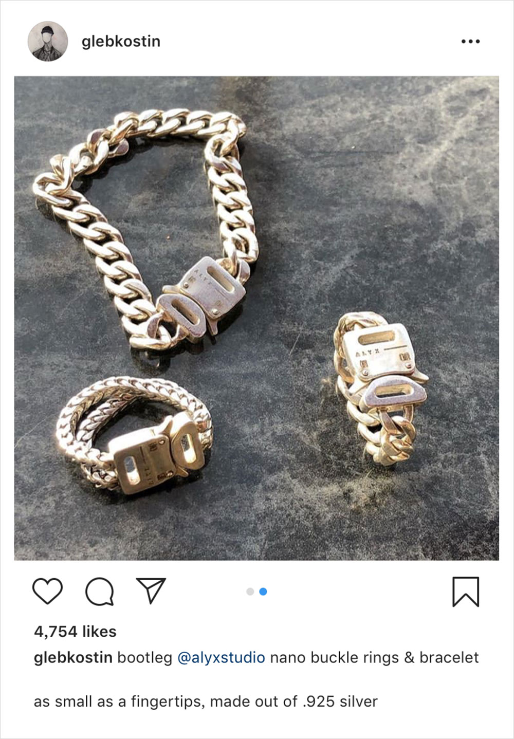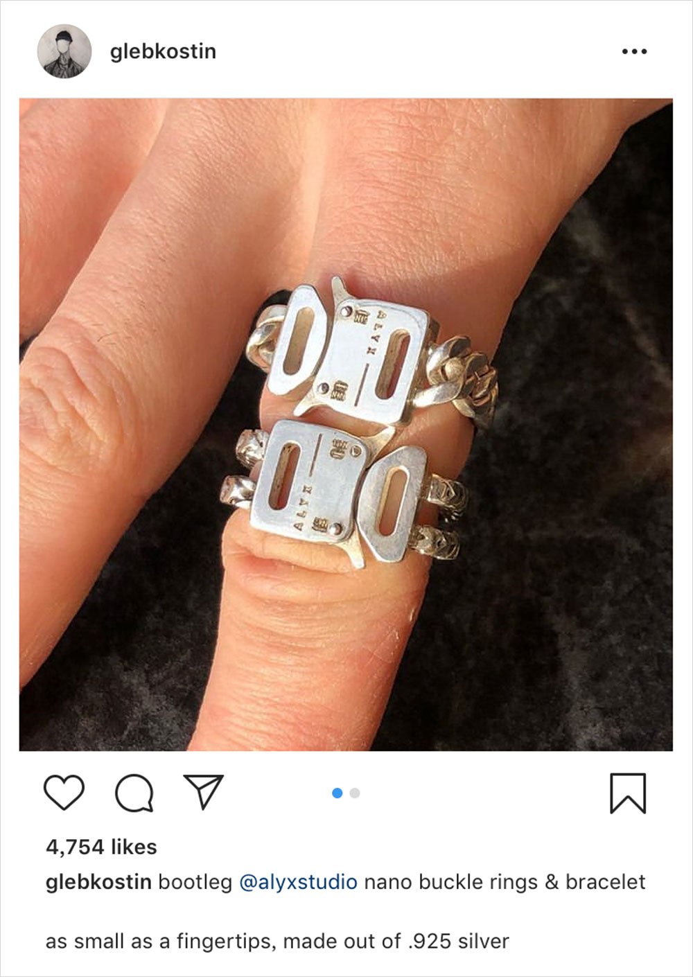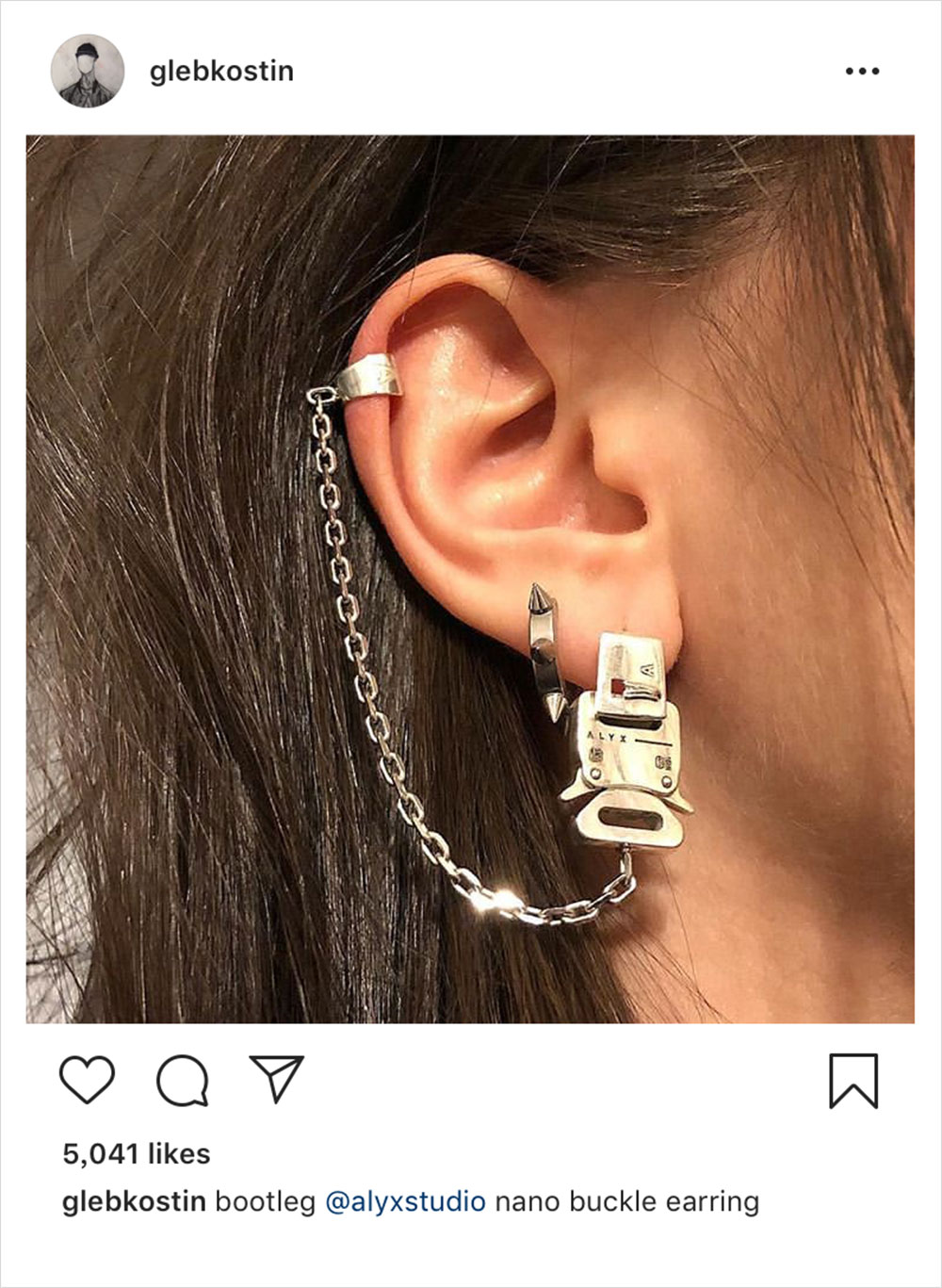 1017 ALYX 9SM 的标志性单品 “Rollercoaster Buckle” 大家一定很熟悉了,此设计也是被品牌用于多种产品上,除了腰带,还有手链、背带、项链等。而 Instagram 上的潮流达人 @glebkostin 近日就在 “Rollercoaster Buckle” 设计的基础上展现了自己的小创意,那就是将其缩小 2.3 倍并制作成戒指和耳钉等单品,有些新兴元素结合时尚的感觉。如果你也喜欢,关注一下未尝不可。