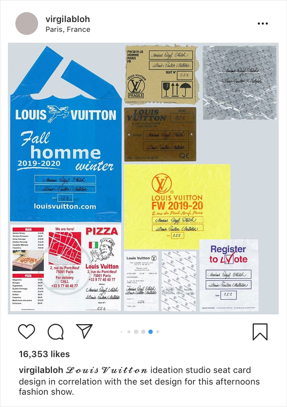 就在刚刚 Virgil Abloh 展示了他操刀的第二个 Louis Vuitton 男装系列的走秀,如果你已经看完正对其进行热议之时,不妨也看看 Virgil 秀前展示的现场的入座卡,不过看到这里你可能会想,一个入座卡有什么好看的?但哪怕是一张小卡片,Virgil 也花了不少心思。塑料袋、购物小票、投票券、餐单甚至是装披萨的纸盒等这些生活中常见但作用不大的物品,可都是 Virgil 在设计入座卡时的参考载体,虽然最终的样式稍显正常,但如果 Virgil 最终选择的是披萨盒… 那走秀的观众岂不都是一群… “披萨爱好者”(脑补一下)?