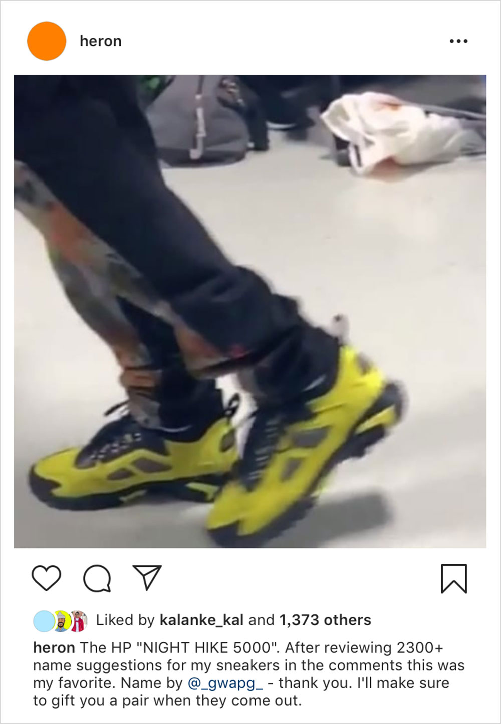 不久前我们报道了 Heron Preston 推出了自个品牌的第一双运动鞋,略微 “尴尬” 的是到昨天为止 Heron 都没有给鞋款想好名字… 对此,Instagram 上的网友们倒是纷纷提供了自己的取名建议,足足有 2300 多条… 今日,Heron 采纳了 @_gwapg_ 的命名创意 “NIGHT HIKE 5000” ,并且会在鞋款发布的时候送上一双表示感谢,实在是羡慕,不过对于鞋款的名字,你们还有什么想法没?