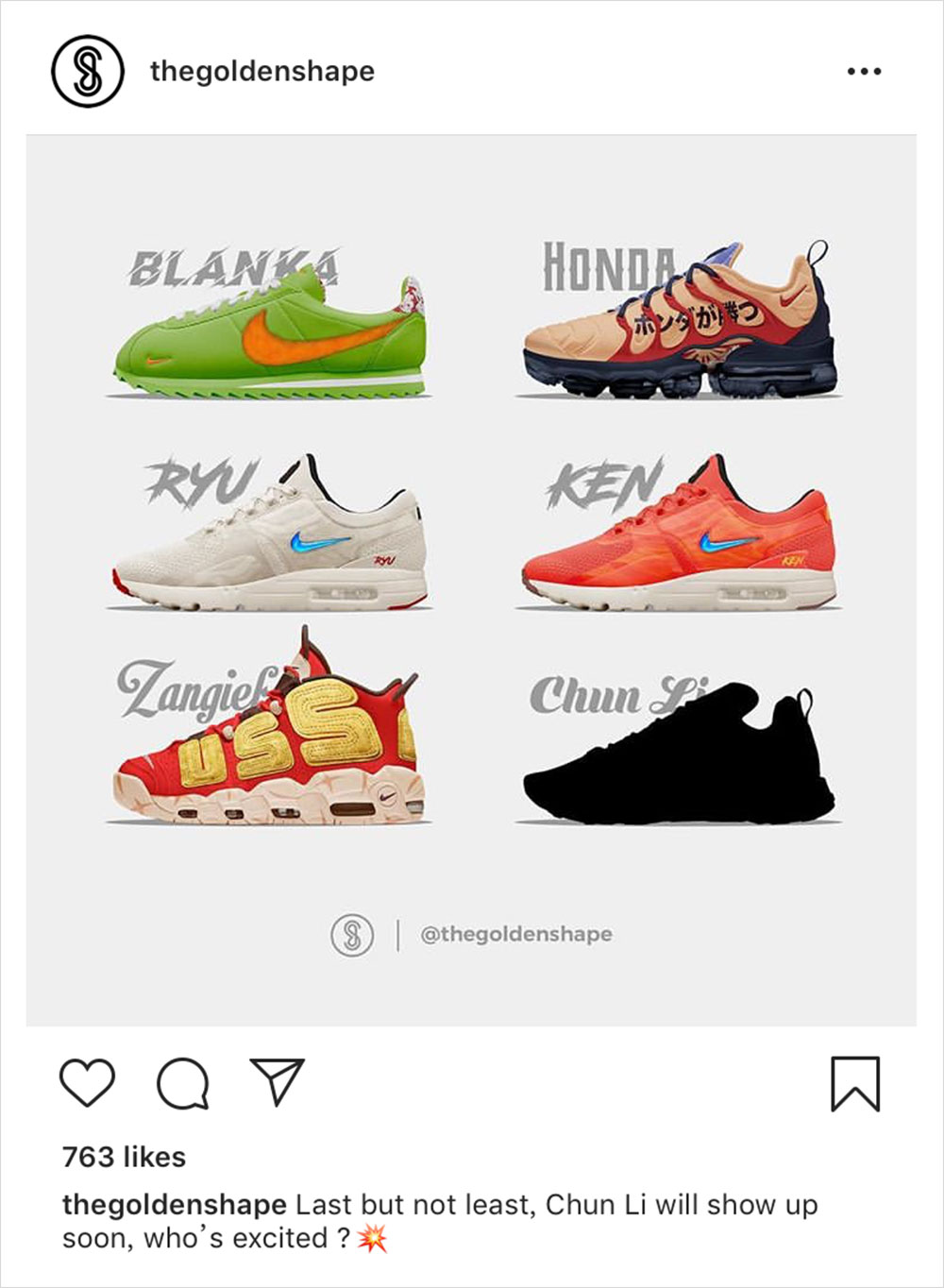 法国艺术家 The Golden Shape 向来喜欢做一些 “假想” 联名设计,所发布的作品也一直备受好赞,甚至还出现仿制作坊将其设计照搬生产的情况… 继他一年前以 “龙珠超” 为主题做了个 Nike 联名后,The Golden Shape 近日再度选择另一经典动漫《街霸》做灵感,在 Instagram 上接连发布了两者的 “联名” 设计,分别根据游戏角色结合鞋型打造了 6 双鞋款。可以看到 “隆” 和 “肯” 是一样的鞋型蓝本,也许是根据这两个角色在动漫里风格极其相似而设计的,虽然 “春丽” 这一角色鞋款还未公布,但你们对另外 5 双是什么看法?