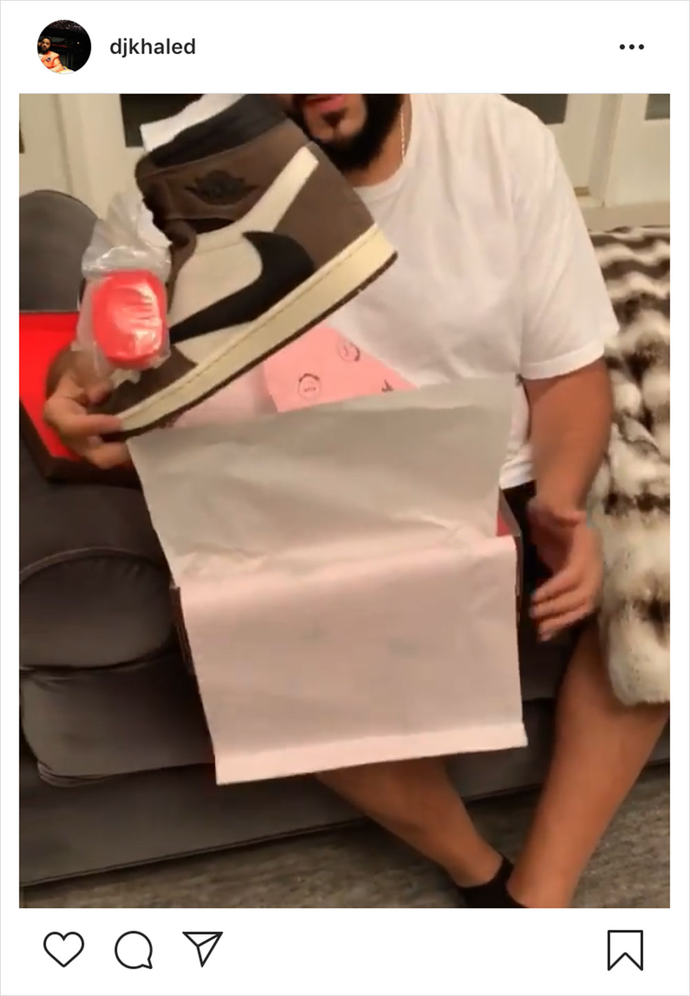经过一波又一波的预热,相信你们都十分期待 Travis Scott x Air Jordan I 的 “倒钩” 吧,虽然这款联名鞋几天前在国外出现过一次突击发售,但要想提前入手,“代价” 可不小,而距离正式的发售时间,却还有两个多月… 古有 “望梅止渴” ,现有 “望鞋止痒” ,既然都看了那么多欣赏图,那不妨看下今日刚收获此鞋的 DJ Khaled 给大家带来的开箱视频吧。片中的鞋盒和粉色的衬纸相信多数人没怎么见过,而鞋款除了那些已知的特点,DJ Khaled 还给大家特别展示了鞋帮内侧的暗袋,开口处设有魔术贴闭合,保证了你想放置零钱或卡片等物件的安全性。