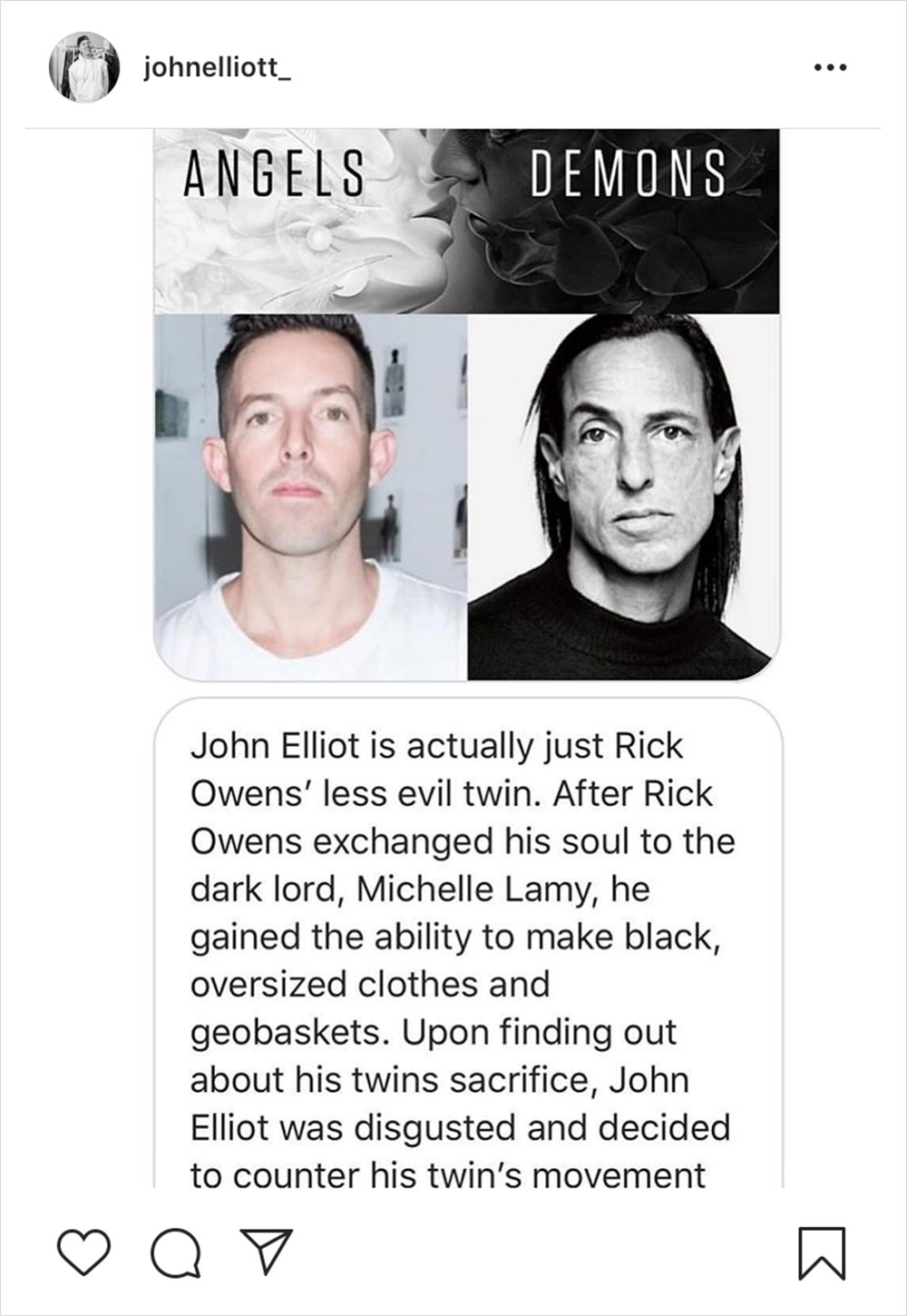 “John Elliot 其实是 Rick Owens 与邪恶相对立的孪生兄弟,Rick Owens 因为与黑魔王 Michelle Lamy 交换了灵魂,所以他获得了制作超大号黑色服装以及鞋款 Geobasket 的能力,John Elliot 发现了他的堕落,开始对其感到厌恶,两兄弟就这样展开了对抗…”