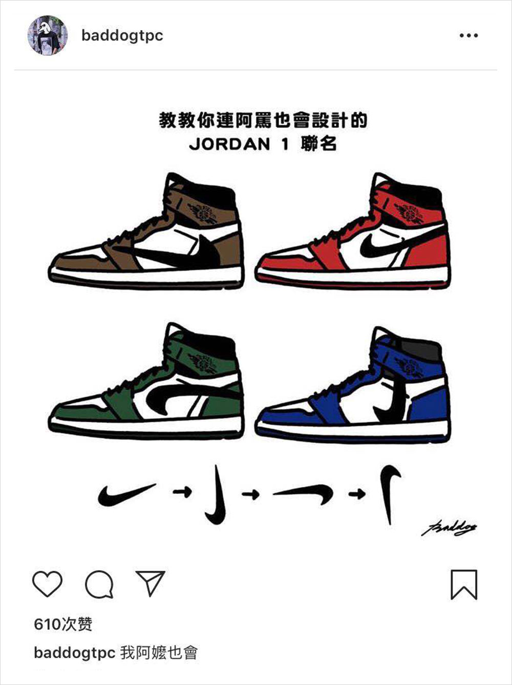 聊了那么多 Travis Scott x Air Jordan I ,相信你们除了 “想要” 还是 “想要” ,没办法,这双鞋的 “倒钩” 确实诱人,但大家反过来想一想,如此设计是否有些 “取巧” 的成分呢?毕竟 “倒钩” 确实罕见,但从设计层面来说并没有什么难度。今日就有账号对此进行了一番调侃,这次是倒置,下次是否就是 “↑↓←→” 了… 不过调侃归调侃,真这么说的话肯定太片面,要知道除了表面上,鞋款可是还有着隐藏在鞋帮内侧的暗袋这一设计细节,好看还有 “功能” ,这不就是好的设计吗?