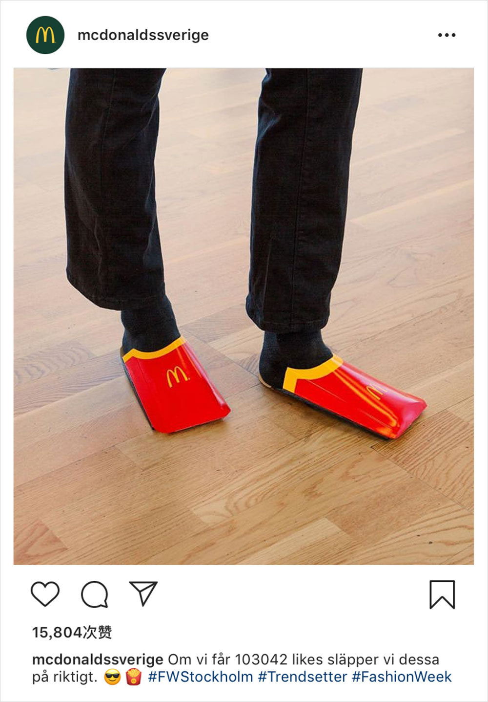 也有不少网友指出,这双鞋与麦当劳薯条的包装盒十分相似,而麦当劳瑞典官方今日也就这些调侃,分享了一张将薯条盒当鞋穿的照片,并表示,只要这张照片达到 103,042 个赞,那我们就真的做一双出来… 如果你们也觉得两者真的很像,那就去赞一个吧…