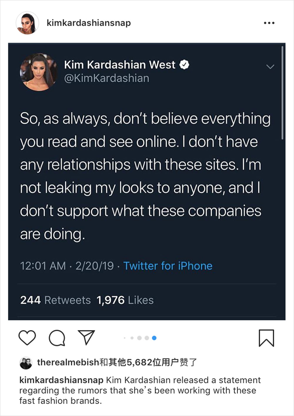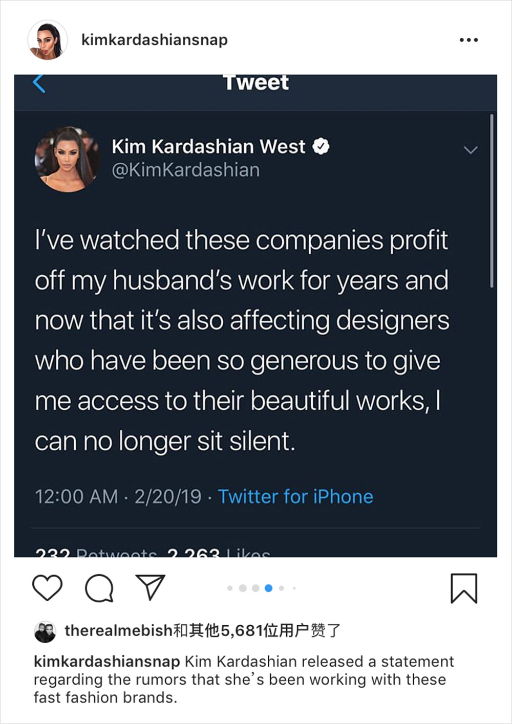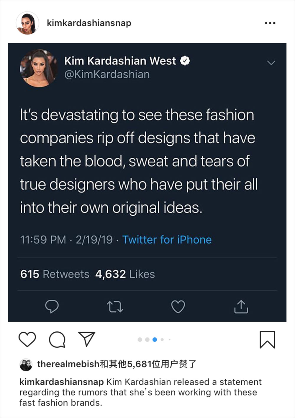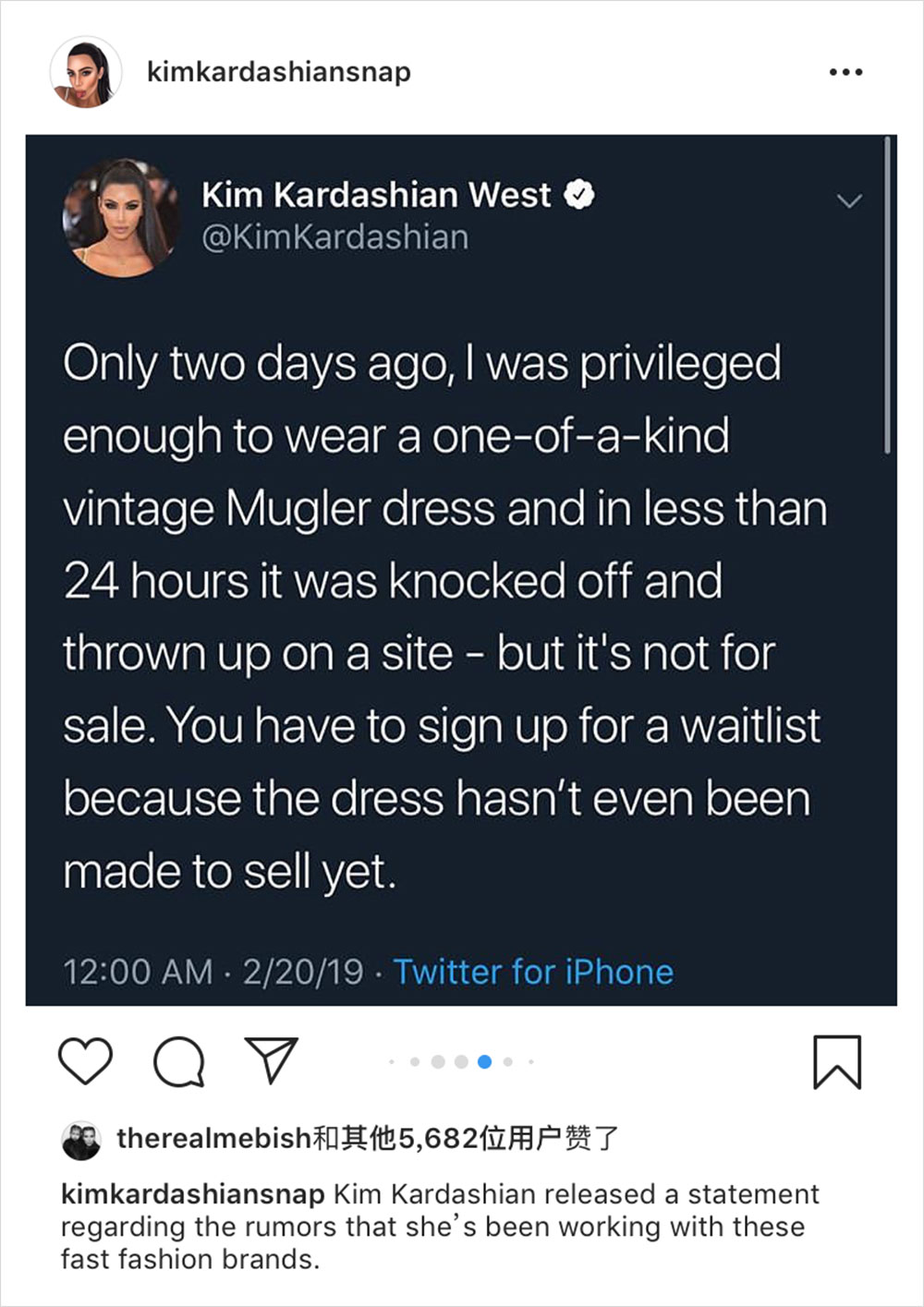 前几日 Kim Kardashian 出席了第 5 届好莱坞美妆颁奖典礼,当天身着 Thierry Mugler 1998 春夏高定礼服的图片获得了不少网友的赞叹。然而在这条礼服获得了关注之后,竟有品牌开始照着模样生产发布了,因此,Kim Kardashian 在社交媒体上开始了对这种抄袭行为的怒斥,为包括自己丈夫在内的众多设计师抱不平,也打破了她和快时尚品牌合作的谣言。