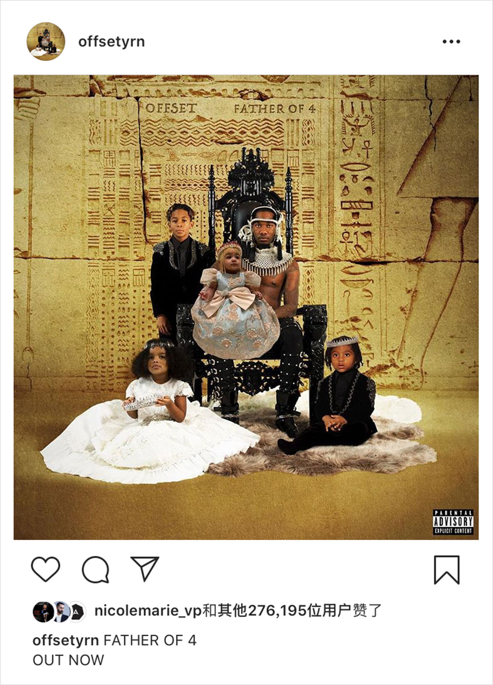 经历了一段时间的预热,说唱歌手 Offset 终于在今日发布了 Solo 专辑《Father Of 4》,并一同释出封面和曲目。专辑封面由 Offset 携他的 4 个孩子共同拍摄,父爱之心显露无疑,其中怀里抱着的 Kulture Kiari Cephus 想必大家都比较熟悉了,是 Offset 与 Cardi B 的结晶。