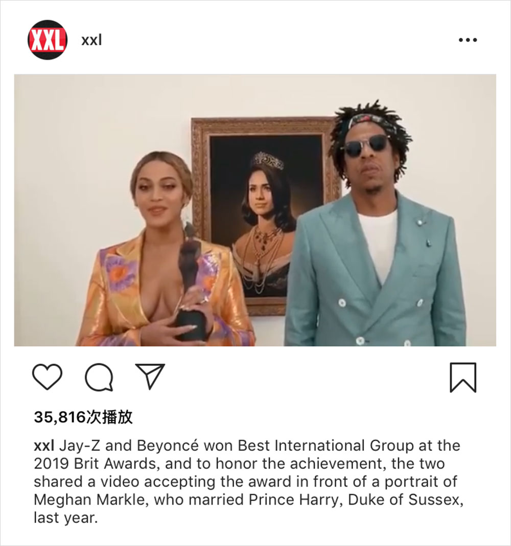在近日的全英音乐奖上,Jay-Z 夫妇被授予国际最佳组合奖,因为未能亲临现场,夫妻二人录制了一段视频表达谢意。看过歌曲《APESHIT》MV 的朋友应该对视频的形式有些熟悉,只是两人将原本身后的蒙娜丽莎画像换成了英国王妃 Meghan Markle 。众所周知,最近是黑人历史月,而 Meghan Markle 则是历史上第一位嫁入英国王室的黑白混血儿,所以此举除了 “致敬” 之外还有更深的用意。