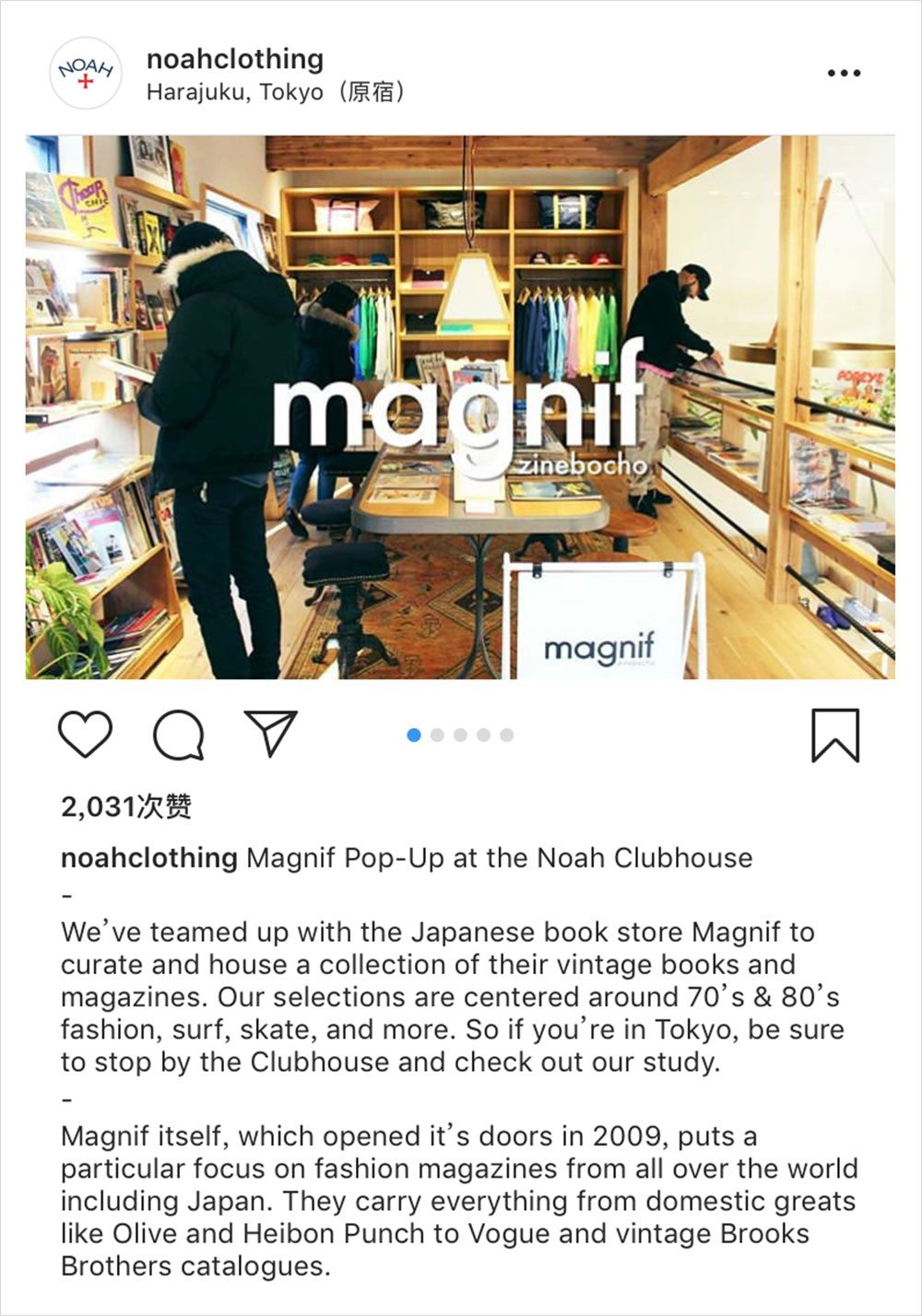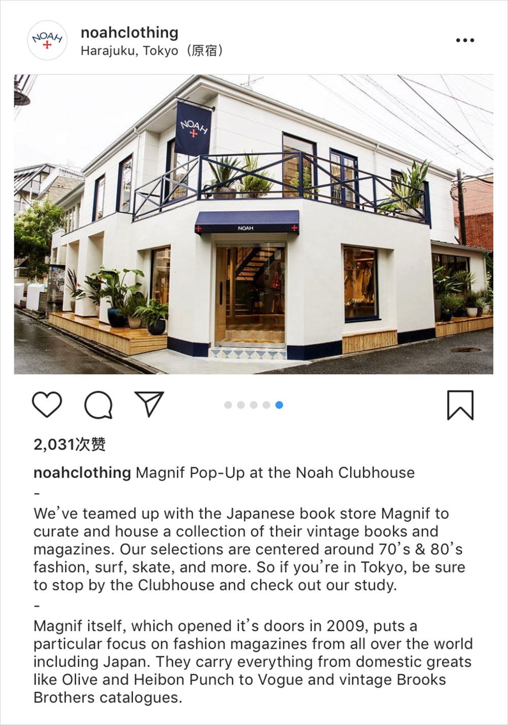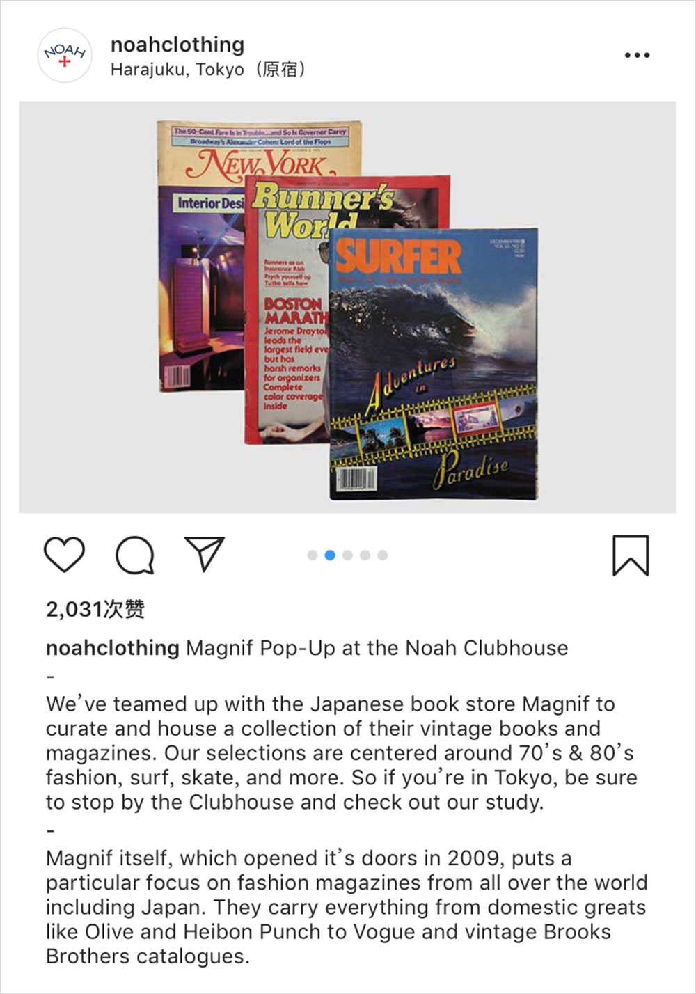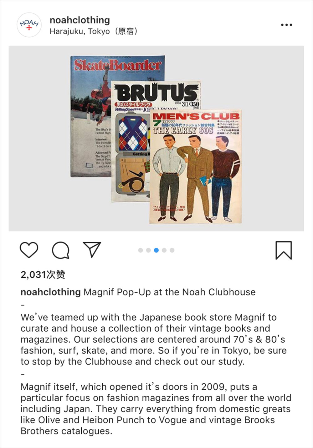 街头品牌 NOAH 近日和日本二手杂志店 Magnif 联手举办 Pop-Up 限定店。然而在活动中,服饰并不是主要展示的产品,而是 70 、80 年代的杂志旧刊,主要集中了时尚、滑板、冲浪等文化内容。不论是《Olive》、《Heibon Punch》这类本地 “佳酿” ,还是《Vogue》、《Brooks Brothers》等知名杂志,活动中都应有尽有。Pop-Up 将持续到 4 月中旬,喜欢阅读的朋友,有机会不妨体验一下。