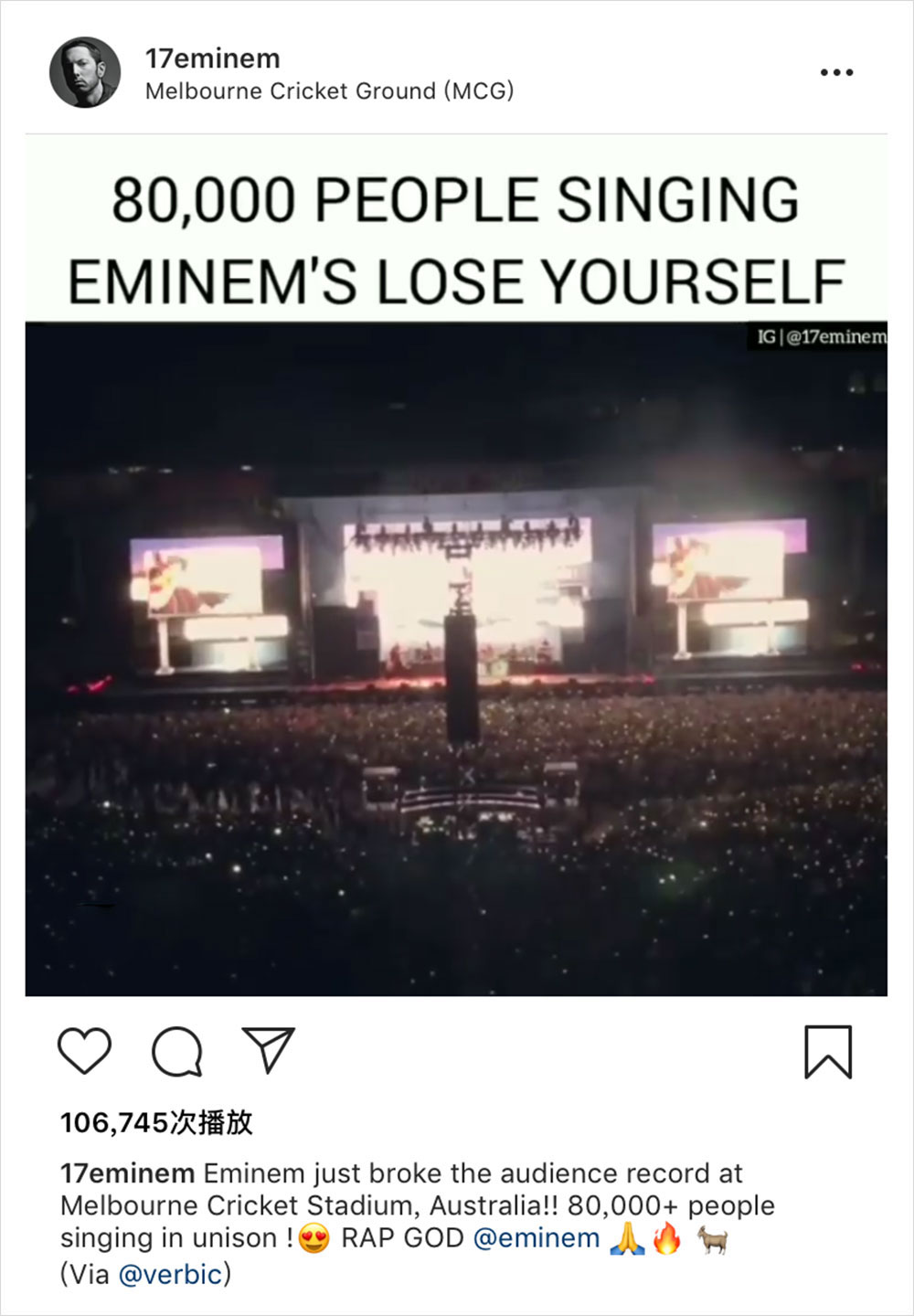 尽管 Hip-Hop 音乐在不断地出现新的风格,但相信在喜欢这种音乐的歌迷心里,总有那么几首经典,比如 Eminem 的《Lose Youself》,每次播放总能给予人内心的鼓励和共鸣,作为传记电影《8 Mile》的主题曲,它也是第一首摘获奥斯卡最佳电影主题曲奖的说唱歌曲。而在 Eminem 近日于墨尔本板球场举办的巡演中,全场 8 万多人就都一起合唱了这首《Lose Youself》,同时这个人数也打破了该场馆的历史纪录,喜欢的粉丝不妨点开视频感受下这番 “浩势” 。
