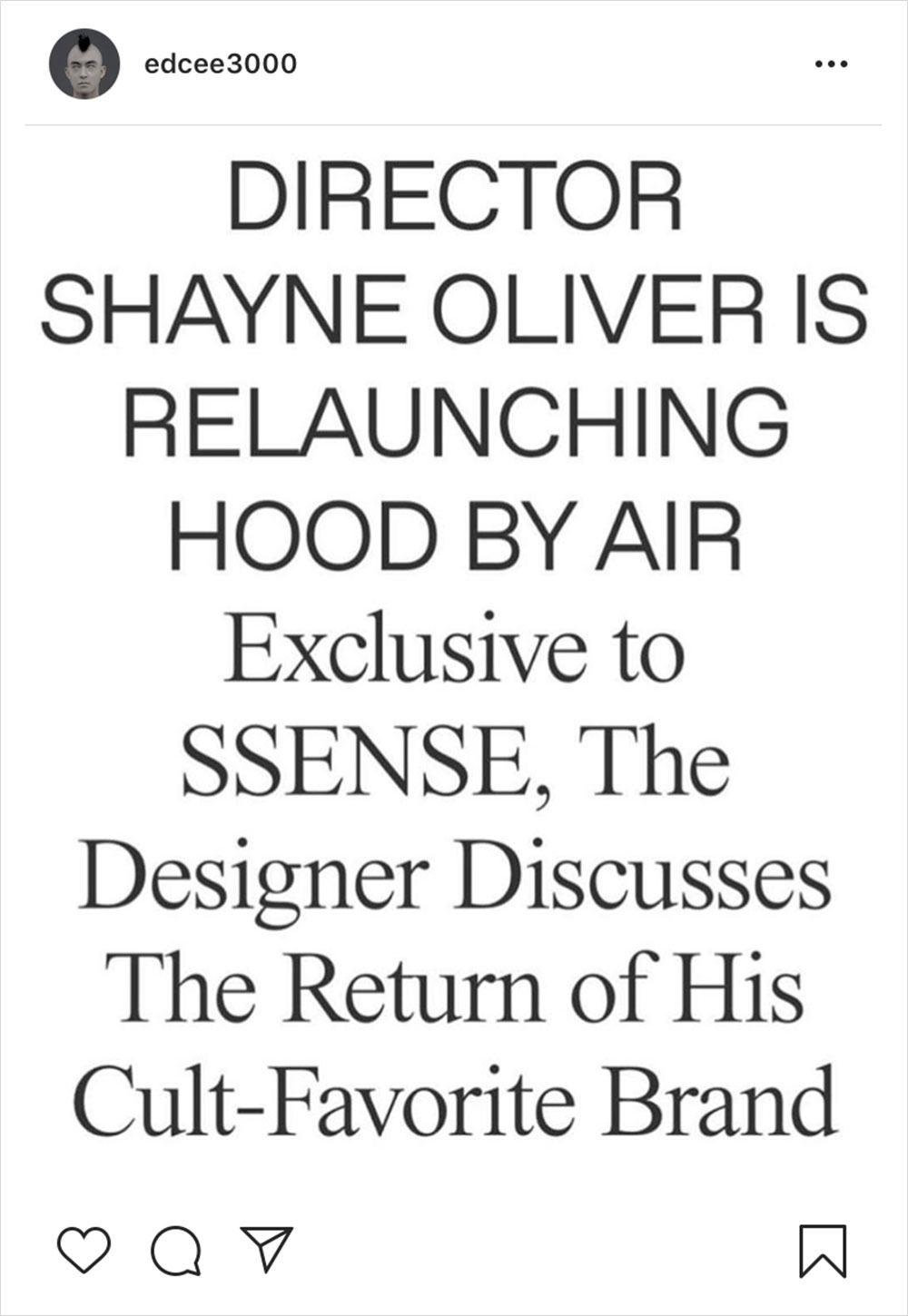 时尚品牌 HOOD BY AIR 在 2017 年宣布了无限期停业,尽管在当时就有不少人认为,Shayne Oliver 和他的品牌已经走到了停摆的边缘,但不免还是让喜欢 HBA 的朋友有些难以接受。而今日,HOOD BY AIR 却悄然回归 Instagram ,并开通品牌主页!据了解,是 Kanye West 和 Shayne Oliver 在时尚杂志《Interview Magazine》的采访通话中促成了此事,而《Dazed》则透露品牌新的系列可能会避开时装周日程进行发布,大家可以开始期待起来啦。