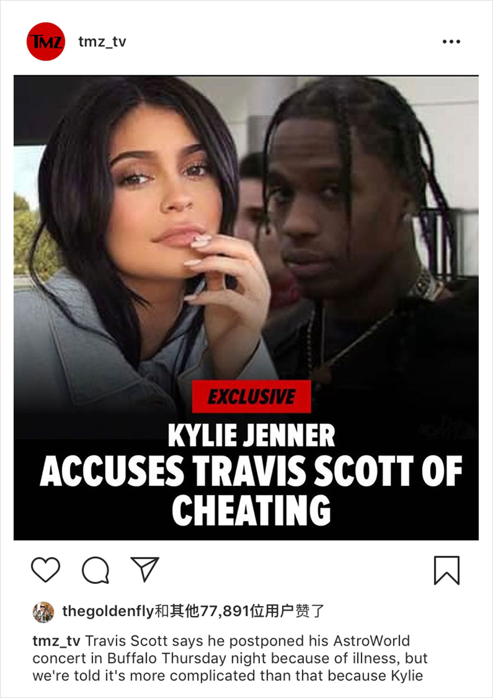 总所周知,Kylie Jenner 和 Travis Scott 在公众前是非常甜蜜的一对,两人还一起刊登过知名杂志《GQ》的封面。然而 TMZ 今日则发出了一则 Kylie 指控 Travis 出轨的消息,并声称已掌握确凿证据。另外 TMZ 还曝出 Travis 推迟周四在布法罗的演唱会而对外声称的 “生病” 的原因,其实就是回 LA 处理家事去了… 至于实情如何,还有待观望。