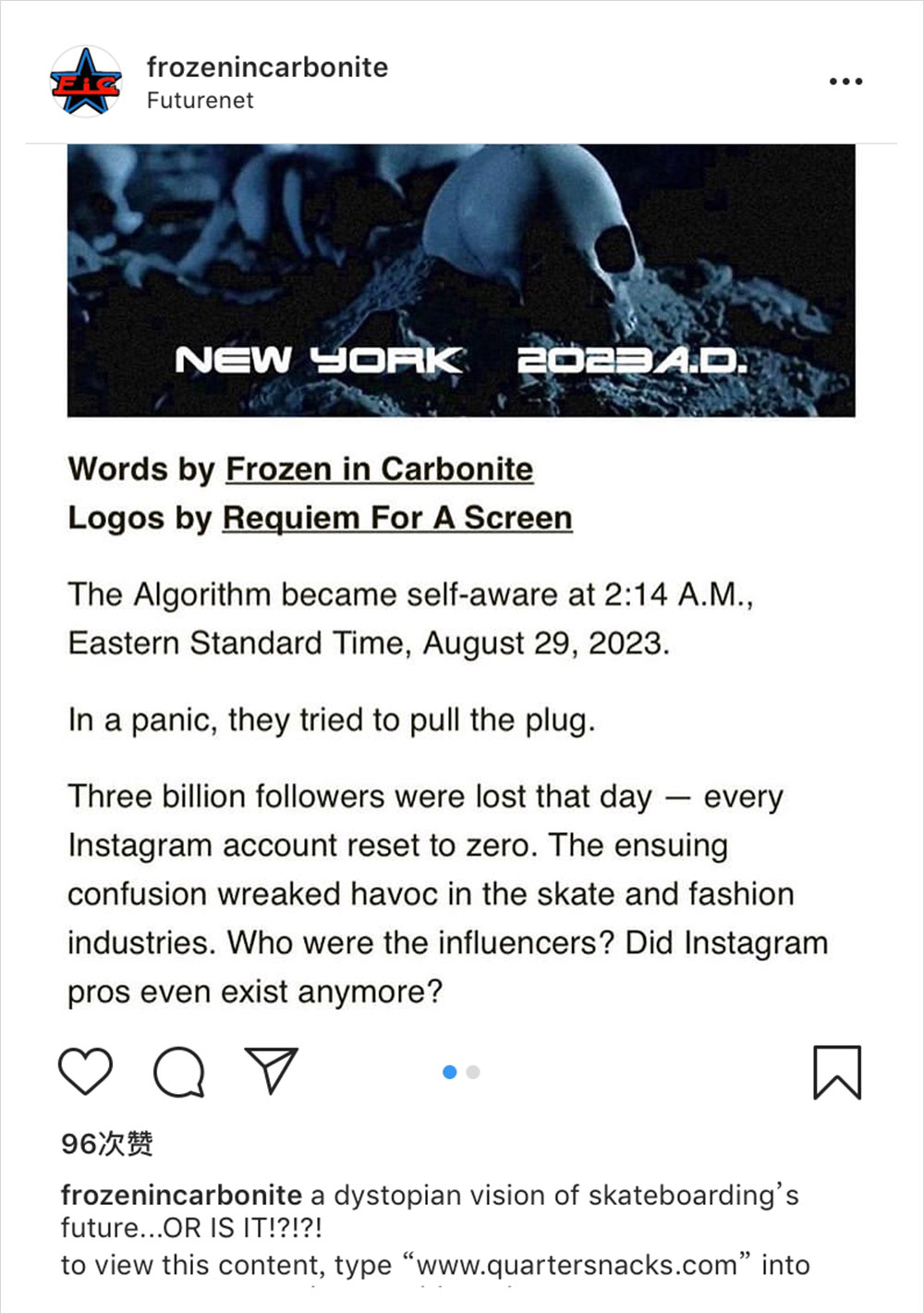 今日滑板账号 @frozenincarbonite 发布了一篇 “臆想” 文,分析了一番滑板在未来反乌托邦式的场景。在他的想象中,所有 Instagram 账号在 2023 年都被注销了,社交媒体的缺失导致了时尚行业和滑板行业的下滑,为此,滑板产业为了文化的延续,想出了个办法,那就是和 Gucci 、Louis Vuitton 、BALENCIAGA 等一些时尚巨头合并,共同发展… 该账号甚至还做出了两个产业合并之后更迭的品牌 Logo ,好让读者更直观地去想象,不过大家还是图个新颖,看看就好了…