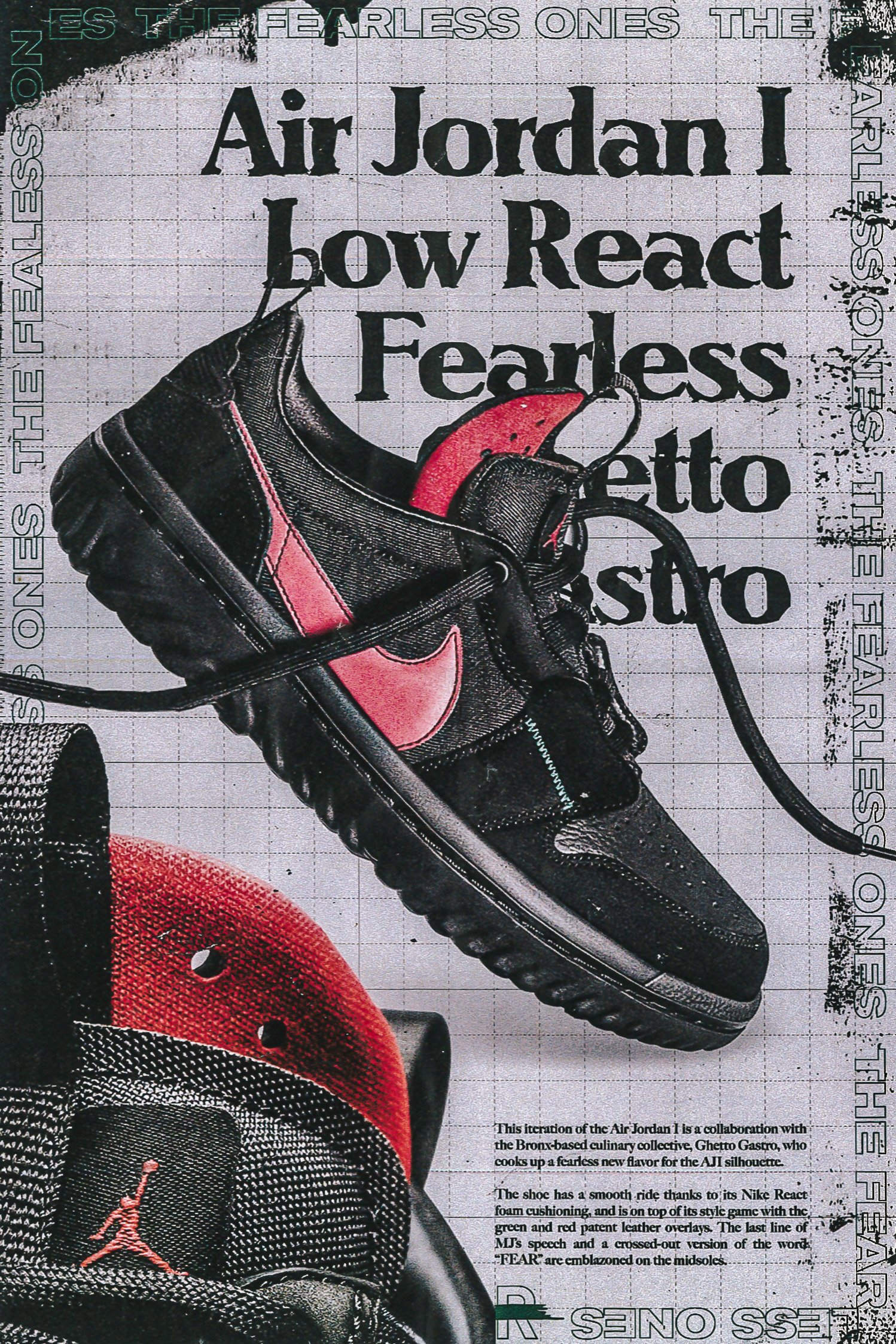 整个系列中唯一的低帮款式,来自与美食家 Ghetto Gastro 的合作。在设计上并非采用了直白的设计语言强调鞋子与美食的联系,而是将烹饪的创新理念融入其中,为 Air Jordan I 注入了新的「风味」,比如…中底的 React 缓震系统。除此之外,纽约这座城市占据了 Ghetto Gastro 个人属性很重要的一部分,同样也是这双鞋的设计灵感,所以你会发现,在视频中我们将他的个人 Logo 改造成了街区地图,也是为了体现这样的概念。