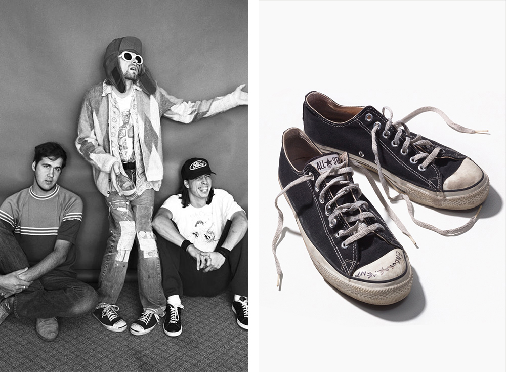 直至 70 年代末,CONVERSE 逐渐丢失了运动领域的统治地位。即便如此,它简单易搭的设计,反在另一方向上赢得了安身立命的根本。摇滚乐队、街头滑板手、潮流爱好者,纷纷着迷于它复古的模样,传奇乐队 Nirvana 主唱 Kurt Cobain 的情迷,更将它一时热捧为某种具有象征意义的符号式单品……