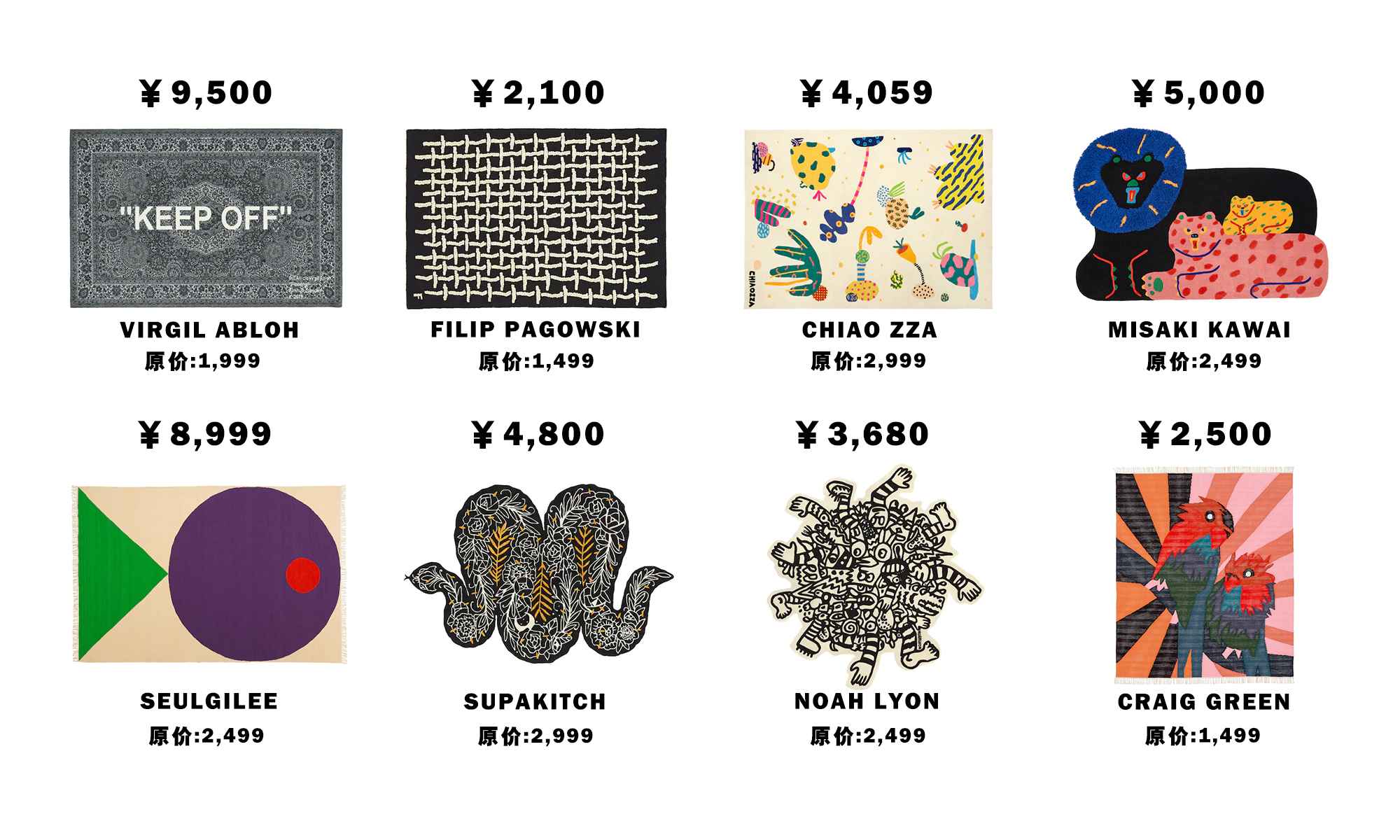除了 Off-White™ 的联名之外,IKEA 这次还带来了 Chiaozza、Craig Green、Misaki Kawai、SeulgiLee、Noah Lyon、Filip Pągowski 和 SupaKitch 共 8 位设计师的联合作品,分别打造了 8 款风格各异的地毯。不过比较限制的是,这次的 ART EVENT 系列仅在上海徐汇 IKEA 以及北京西红门 IKEA 限量抽签发售,身在外地的朋友直接哭晕在…
