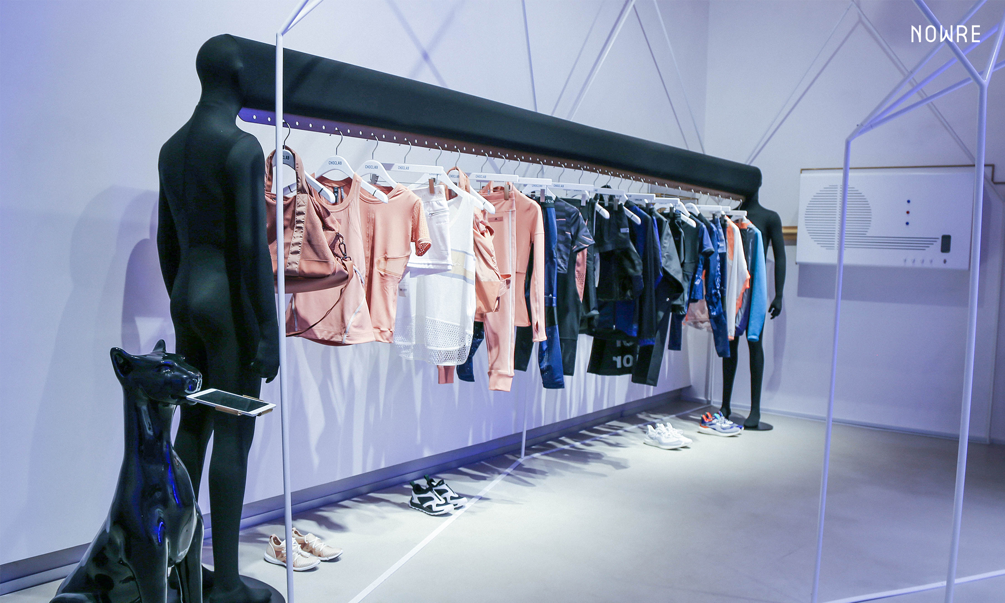 这一层展示的是些年轻化的品牌,考虑到品牌的特性,因此也选择了有趣味性的陈列和道具。比如说由两个人脸拉长变成的货架,不仅具有装饰性,人型也可以更换外套,而且正好契合服装与 “人” 相关的理念。