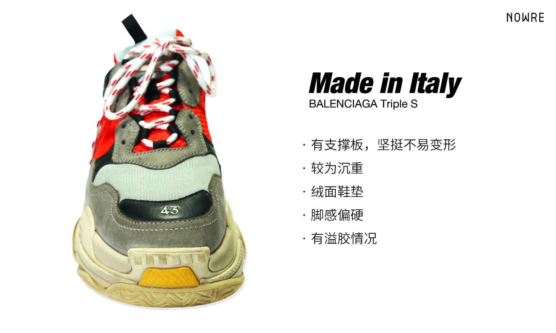 这次,我们也特地为大家准备了两双 Triple S 以供对比,一双 Made in Italy 的红蓝配色,一双 Made in China 的黑红配色,均为 43 码。选择一样的尺码是为了最大可能的减少误差,更可以验证官方所说的 “轻量化” 是否属实。