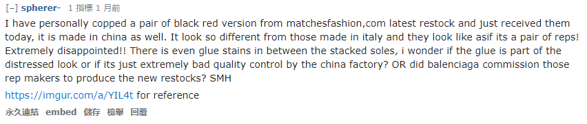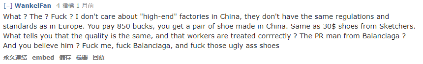 事情的起因是一位网友花了 $850 美元买来这双来自法国的 Luxury Sneaker,到手之后发现竟然是 Made in China 的,并非官网所说的 Made in Italy。随即就向官方发起了投诉,得到的回复是:为了打造更加轻量化的球鞋,目前 Triple S 的制造已经交由中国厂商负责。对于这件事,国外网民就有几种看法: