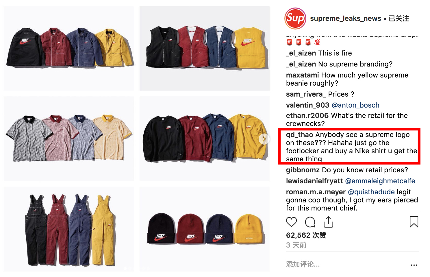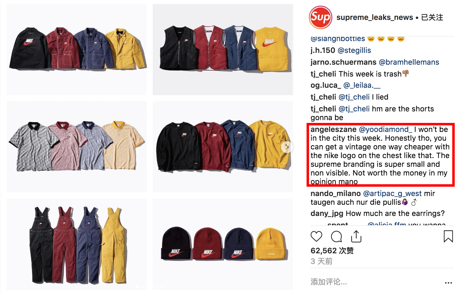 针对这个情况,社交网络上出现不少吐槽的声音:“有人能看见 Supreme Logo 嘛?去 Foot Locker 买一件 Nike 你就能获得同款了”、“Supreme Logo 实在是太小了,(这个系列)不值得我花钱去买”、“去 Outlet 买一件 Nike 得了,如果你喜欢这个系列”…