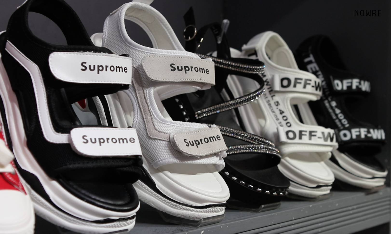 在这边,一件 T-Shirt 的售价基本上都是两位数,稍微“高端”一点的大概需要 100 元左右,外套、鞋子几乎都在几百块的幅度。这些东西都有一个共通点,卖得最好的款式基本上都和山寨脱不开关系,例如 Off-White™ 的减速带,另外 Supreme Logo 也是随处可见。