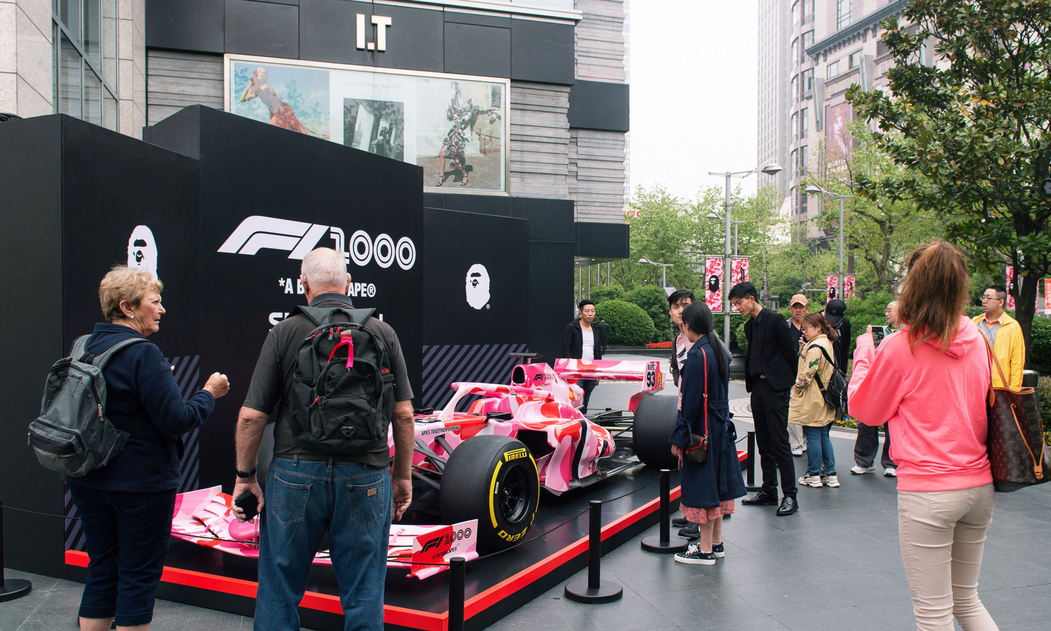同时在这次意义重大的分站赛,还有一位比较不同的主角:A BATHING APE®,和 F1® 联名做了一辆粉色迷彩涂装的赛车。你可能会比较好奇,BAPE® 和赛车有什么关系?那这里我们就要好好说说了。不过首先,我们先看看这次 F1® 中国站,都有些什么特别的地方。