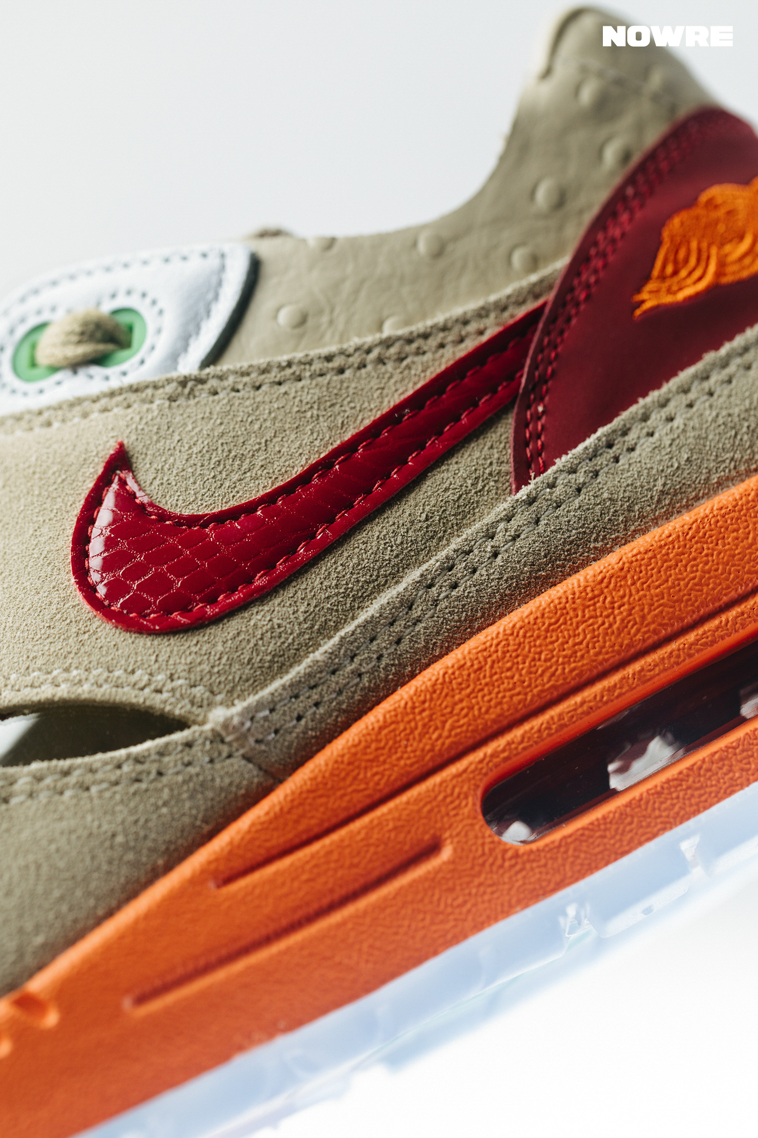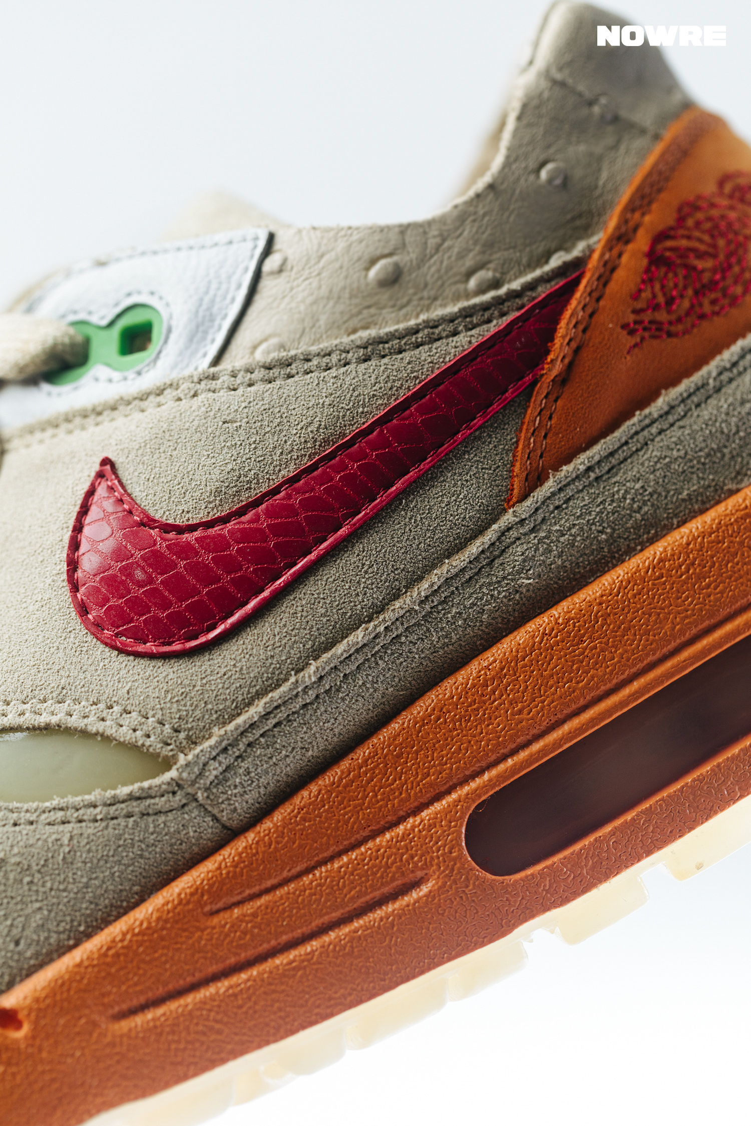 整体配色方案被完好地保留了下来:沙土色的主色调配合橘色、红色、绿色等细节组成了低调又颇具中国特色的观感;同时鸵鸟皮、Swoosh Logo 的纹路、翻皮鞋面等初代具有代表性的元素也延续到了今年的版本上。