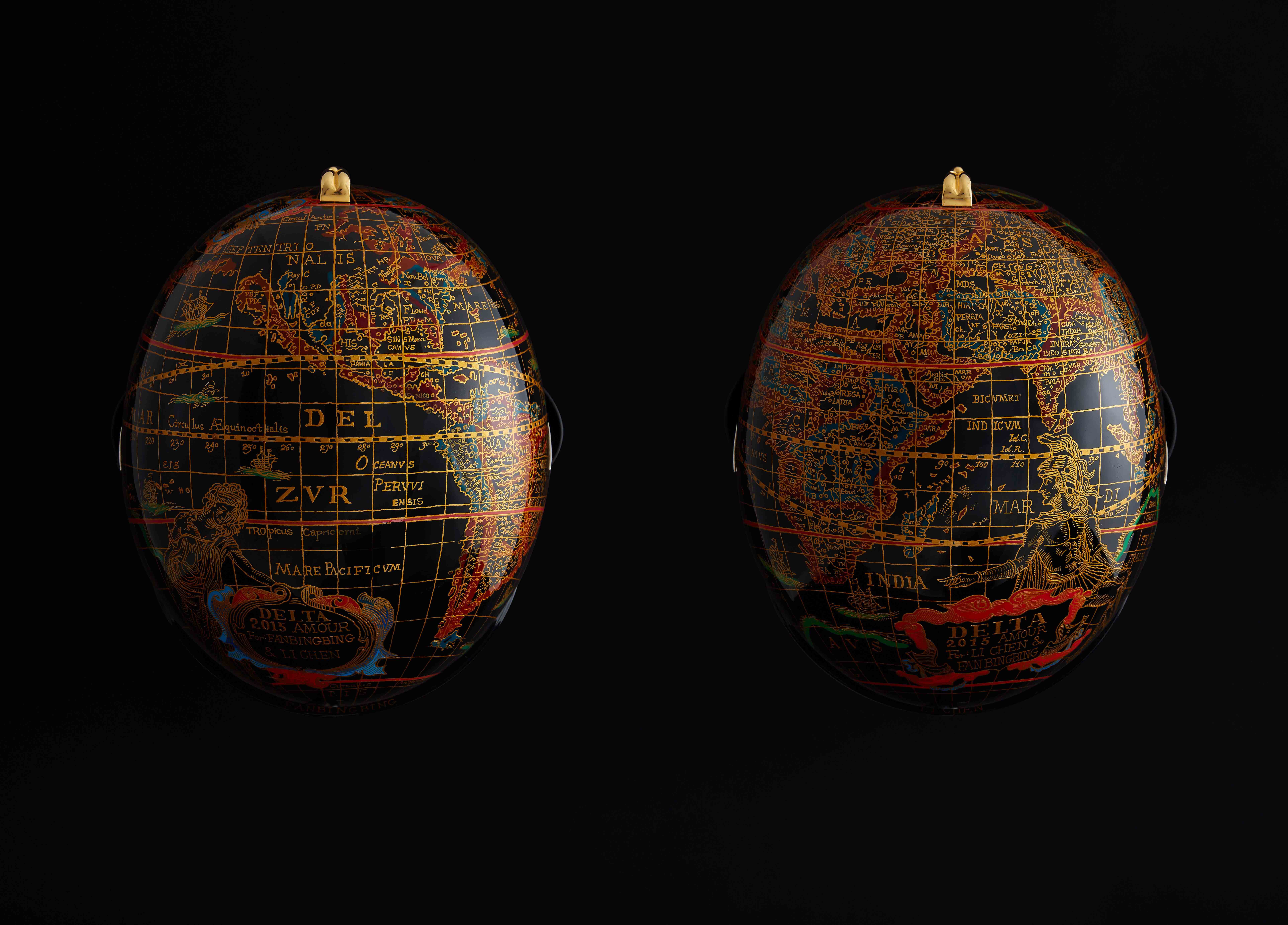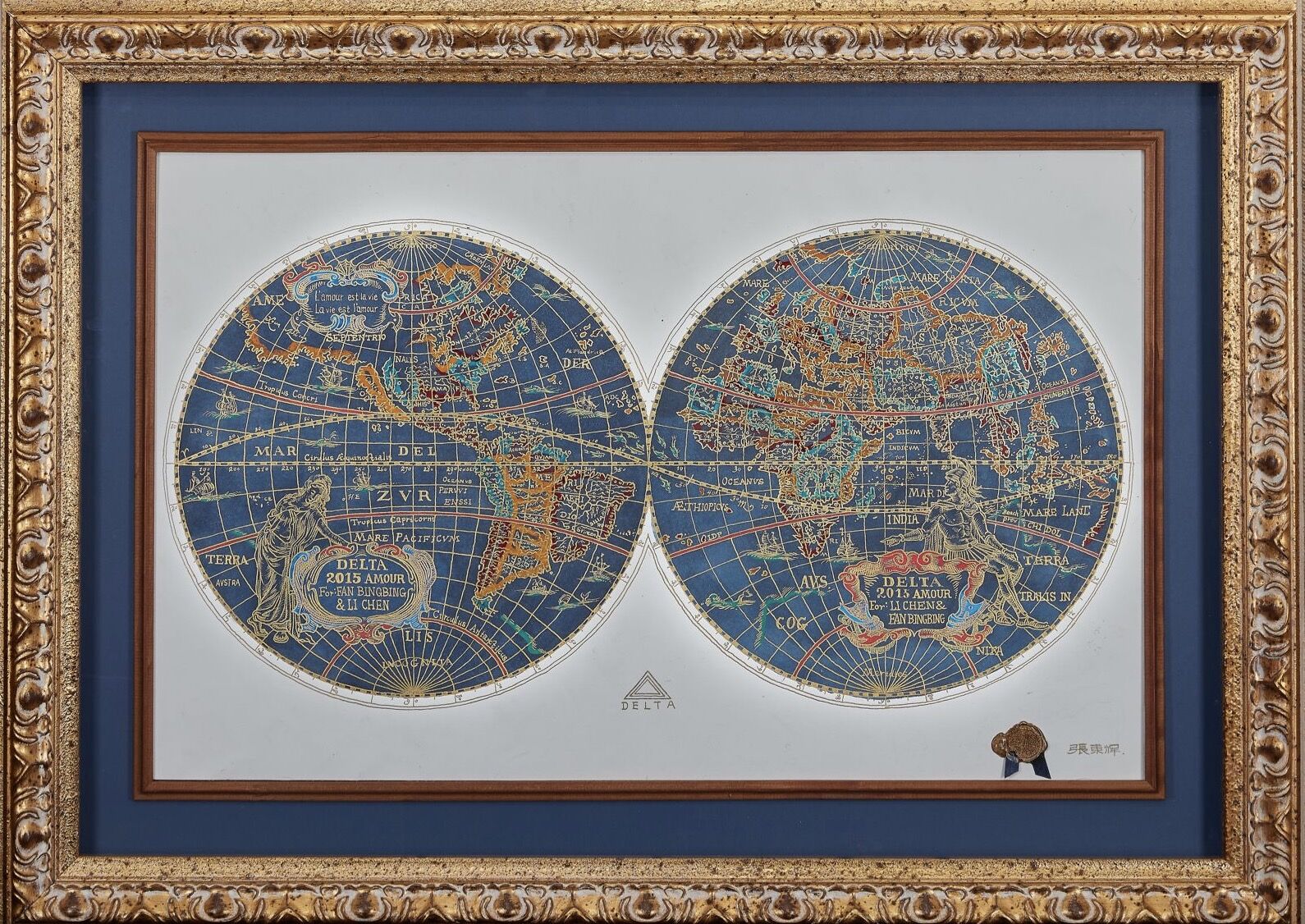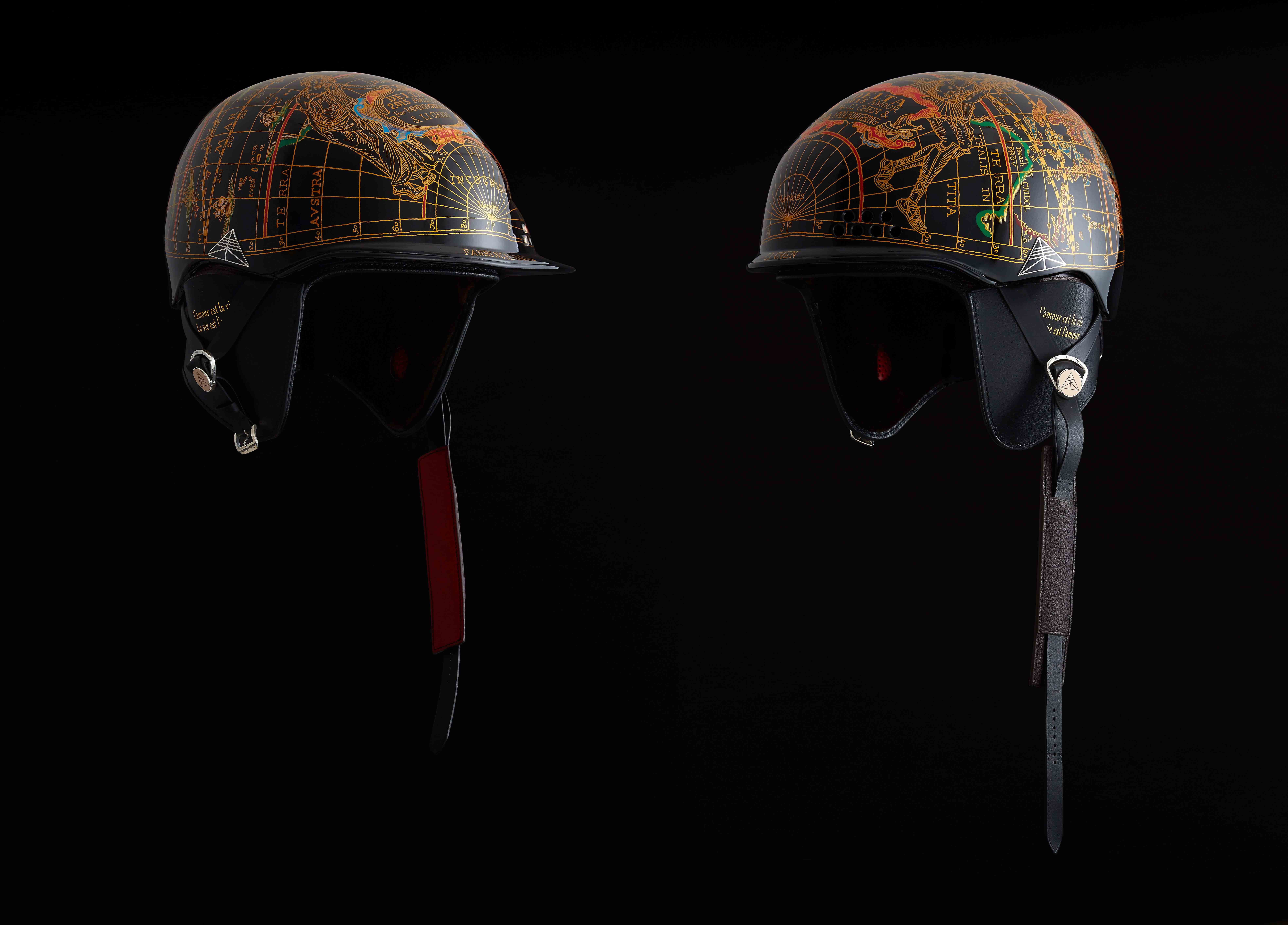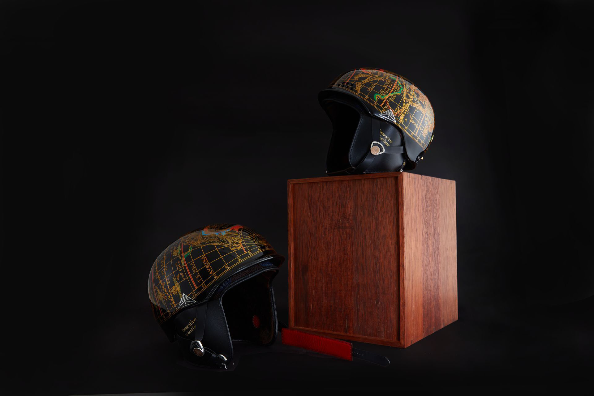 在做完王思聪的定制头盔之后,张东辉也开始小有名气。经朋友的介绍,一些别的明星艺人也开始过来找他定制头盔。例如下图的这一组情侣头盔,他就将中世纪的地图一分为二,分别是欧亚板块和美洲板块,当两个头盔放在一起就组成了整个世界,同时绘制上了墨涅拉奥斯国王和海伦这一对古希腊神话中的情侣的爱情故事,两人相互对望。
