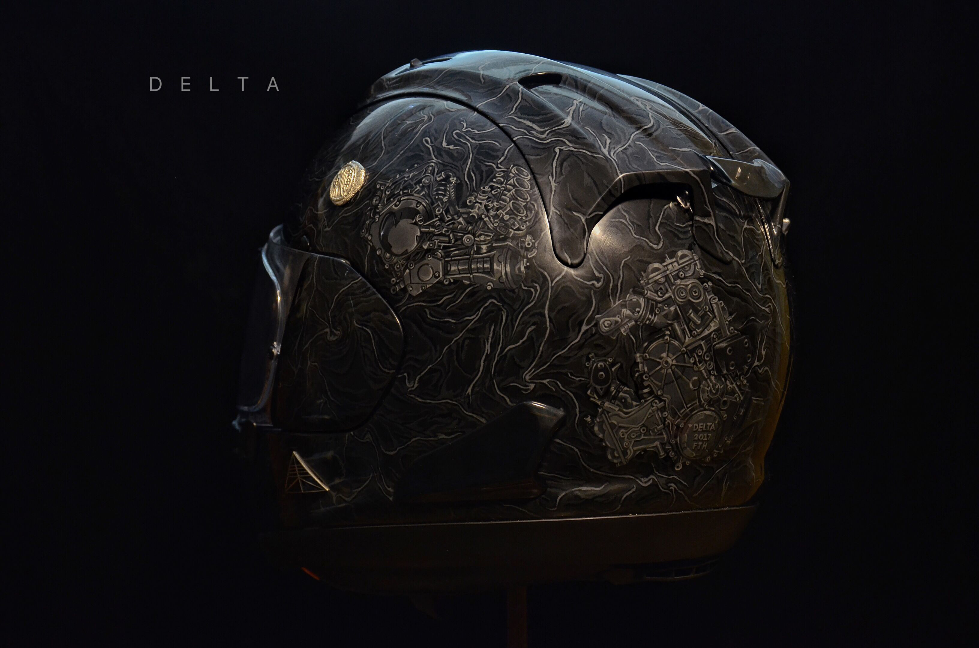 这相当于是我的一种状态吧。从一开始学画画、到慢慢可以控制画笔和大脑的思考,再到后来越来越熟练,每个人都会形成自己的风格以及绘画的基本面貌。我的面貌就是让画面趋于饱和,如果一个东西本身的造型不复杂,那我会塑造得很深入。反映到头盔上也是一样,不满的话我不踏实。其实也就像大家的工作状态,如果每天没事干总是睡觉,这会让人特别沮丧。但如果这一天的工作安排非常满,哪怕是自己不喜欢的、没有创造性的工作,只要有事,做人就踏实。