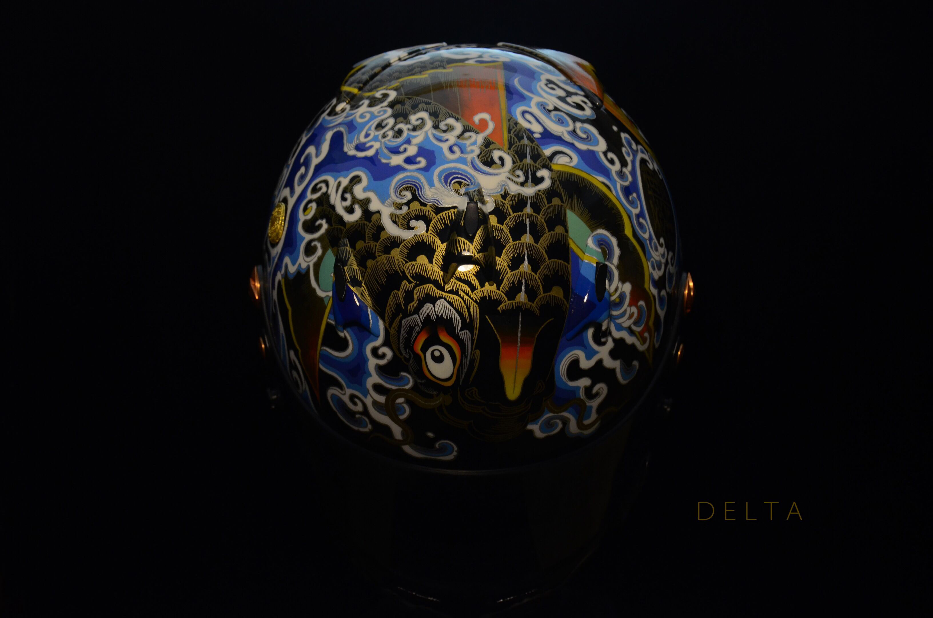 头盔现在都是客户找过来订做,一般会有几种情况。有些他很明确要什么并且带好了方案;另外还有一些是有大概的想法,但不确定自己要什么,这就需要我帮他们图像化,把思路捋顺;还有的是完全信任我,让我自由创作。这些都需要先跟客户定方案,定完以后我再画草图。沟通的没问题了,我再在头盔上开始操作。但头盔是球体,草图是平面,这就需要第二次安排构图。在这之后就是一次填色、罩清漆,最后组装零件。现在平均一个月可以做完一件,但具体时间也根据复杂程度有所变化。