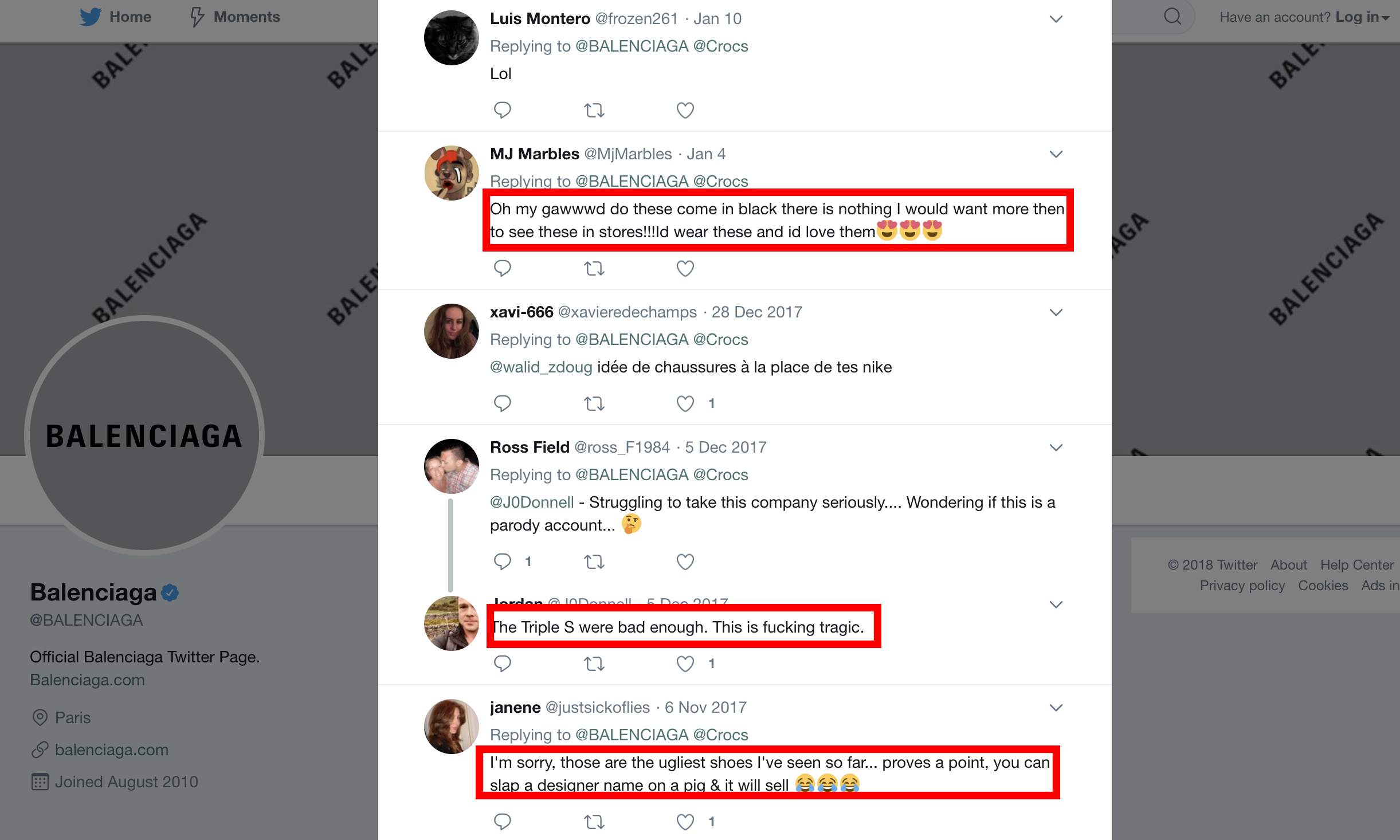 有 Twitter 用户在它预售当天全部 Sold Out 的新闻后留言:“烧掉他们吧,BALENCIAGA 很糟糕。”、“对不起,这应该是我目前为止见过的最丑陋的鞋…但至少证明一个事实,给猪身上印一个知名设计师的名字,它应该也很好卖。”