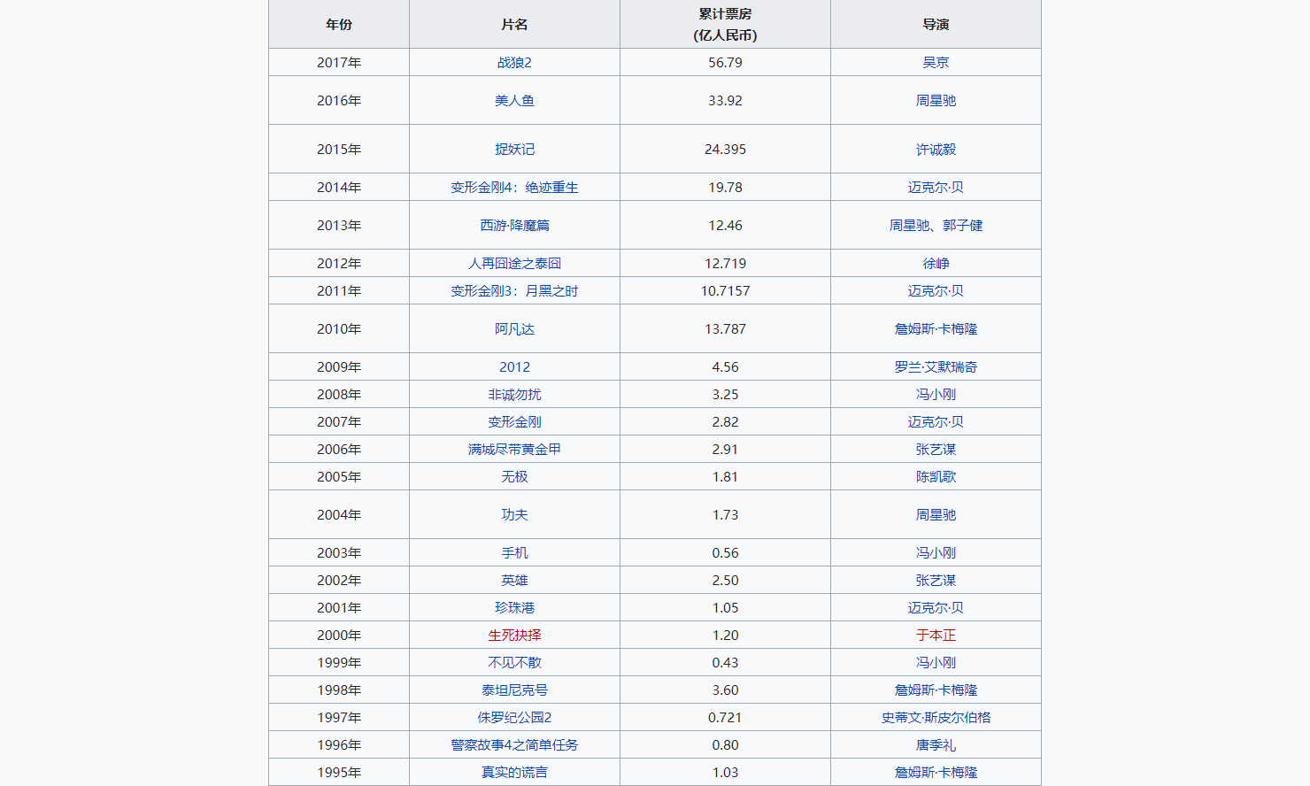 中国内地上映电影历年最高票房(图片来源:Wikipedia)
