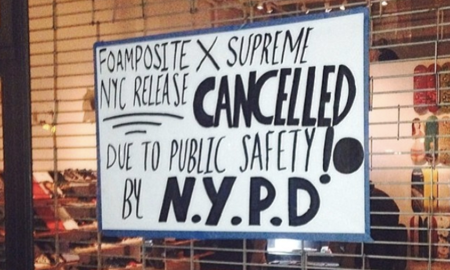 到了近几年,由球鞋而引发的 “非常规” 事件越来越集中在发售现场:2014 年,NYPD 叫停了 Nike x Supreme Air Foamposit One 的发售,因为海量的排队人群导致交通阻塞和安全隐患;同年,一名 15 岁的布鲁克林骚年在排 Air Foamposite One “Yeezy” 时挨了子弹;没过几个月,一名男子在纽约某 Nike Zoom Vapor AJ3 发售现场外掏出一把枪,导致发售被取消。
