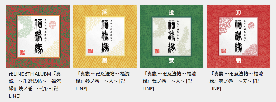 MANJILINE 的终极之作是去年发行的《真说 ~卍忍法帖~ 福流縁》,天、地、人、流四卷以三张 CD 和一张 DVD 呈现,每张 CD 里面有 9 首曲子。“这里面的几乎所有曲子都是和一些我很想搭档的音乐人合作的,某种程度来说,这是我里程碑式的作品。对我来说代表生存之道、生存的意义,是自己的武器,向这个世界表达自己的方式。
